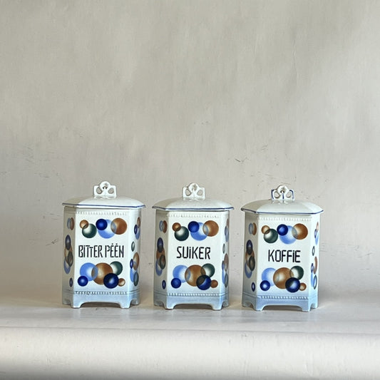 Antique Belgian Art Deco Porcelain Spice Jar Set – 10-Piece Kitchen Storage
