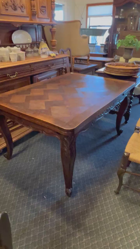 French Oak Parquet Dining Table with Pull-Out Leaves & Six Rush Seat Chairs