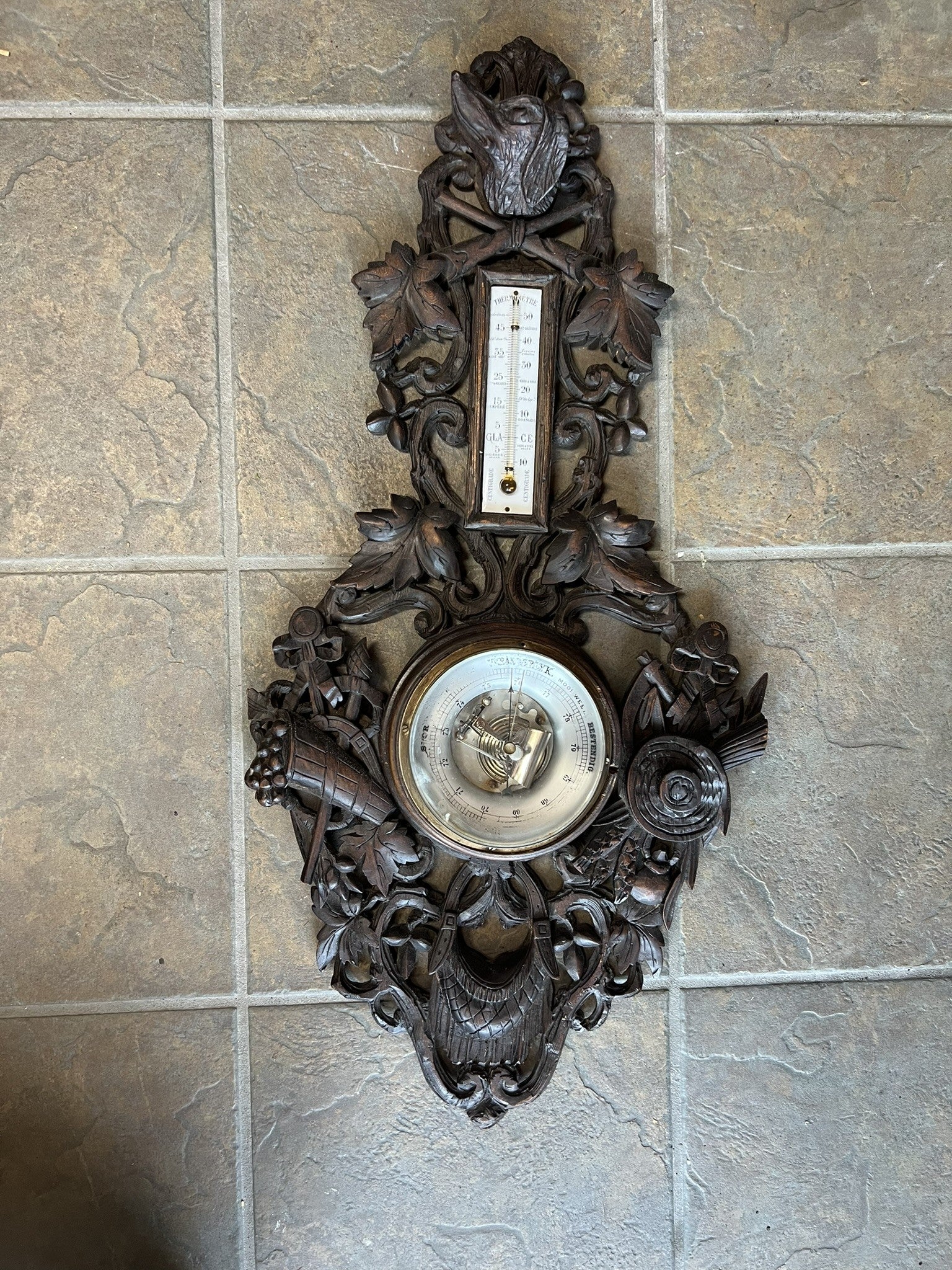 This antique French Normandy barometer features a richly carved dark oak frame adorned with foliage, grapes, and a striking dog head crest. A true 19th-century artisan piece, it combines thermometer and barometer functions, making it both decorative and functional. A remarkable addition to rustic, European, or hunting lodge-inspired décor.