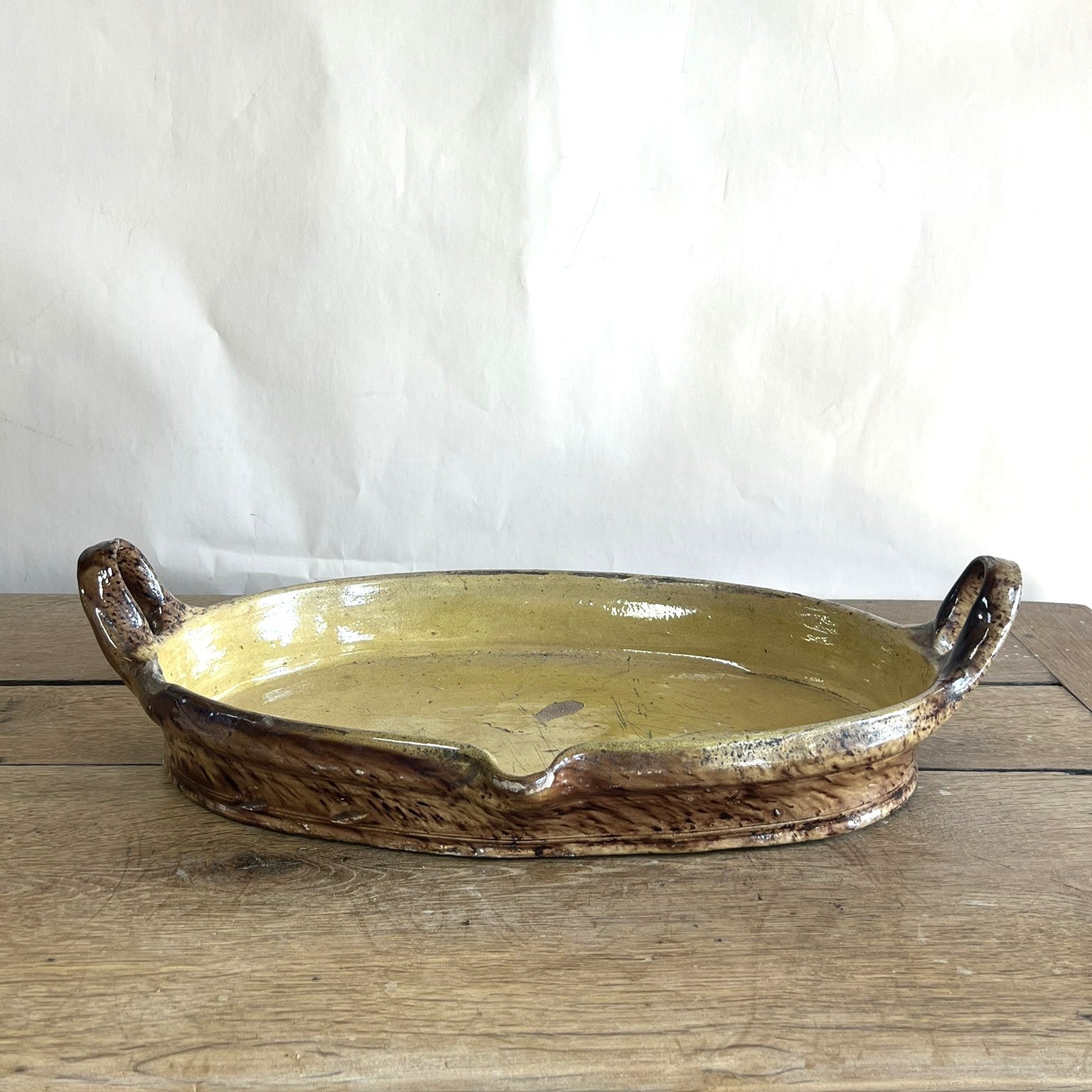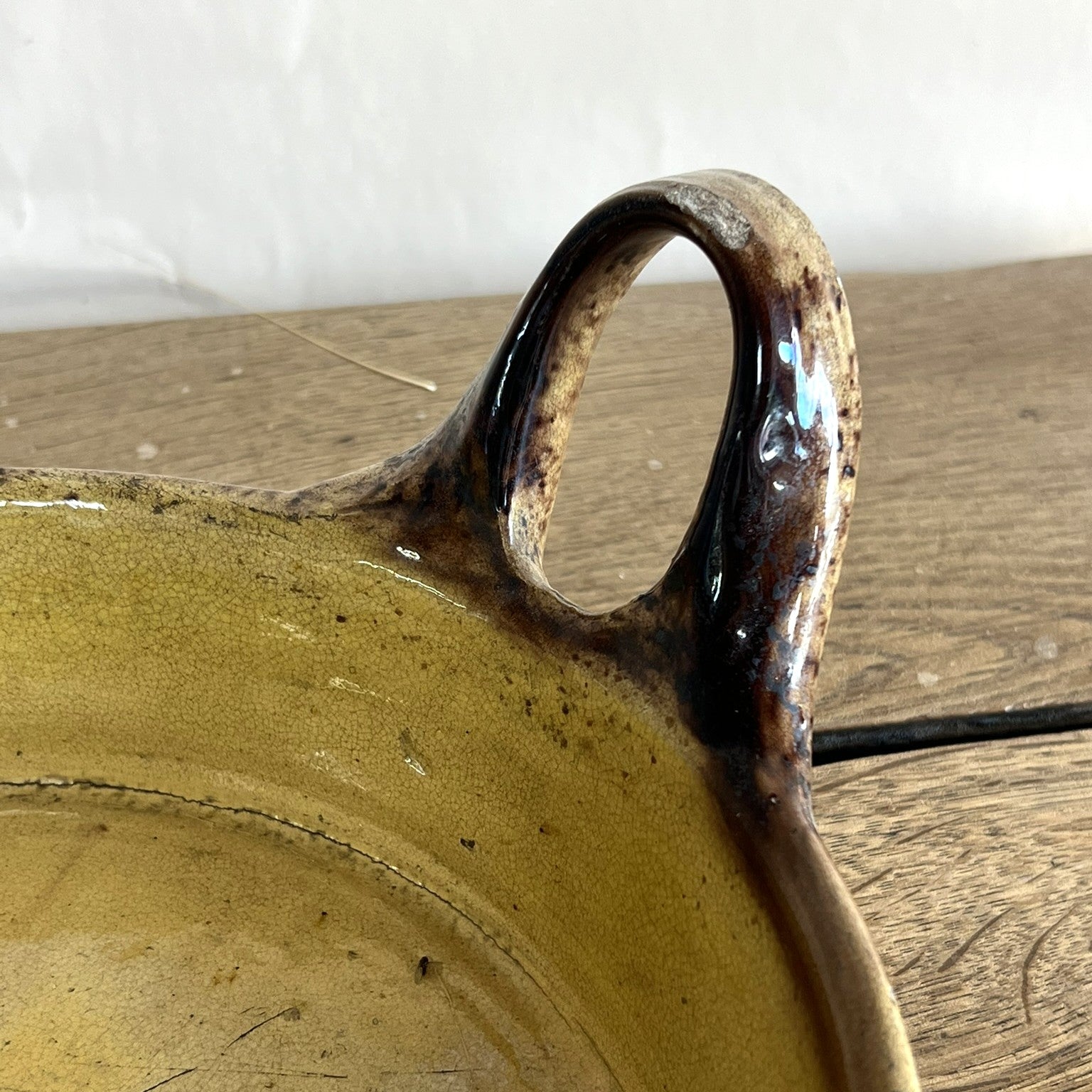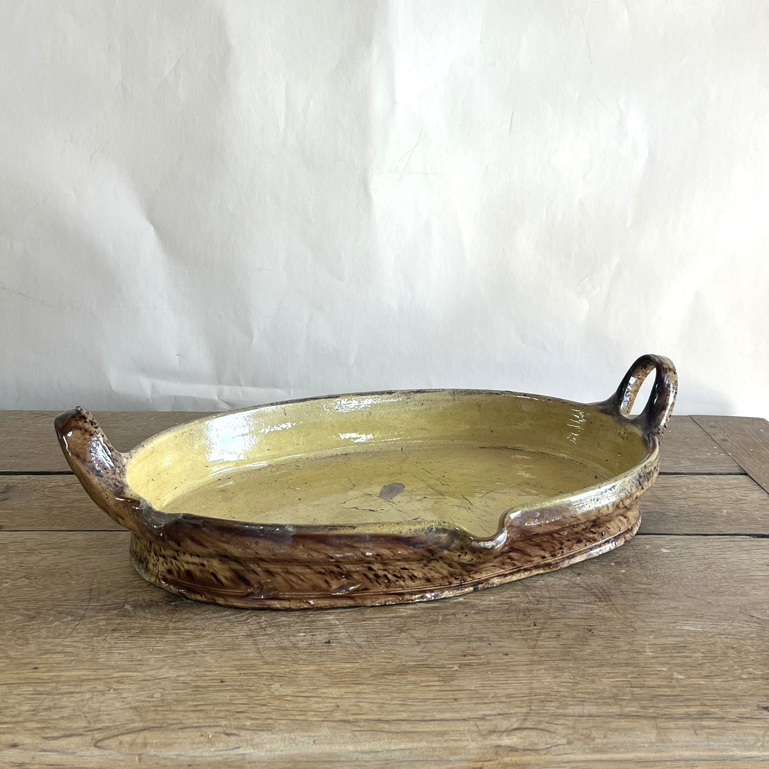 This antique French baking dish features a beautiful mustard-yellow glaze inside and earthy brown tones outside, with two loop handles for easy carrying. Once used in farmhouse kitchens for roasting and baking, it now makes a striking decorative statement or functional serving piece. Its generous size and rustic patina bring authentic French country charm to any home.