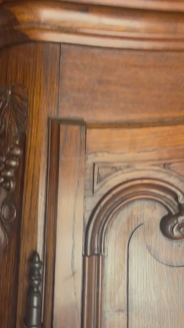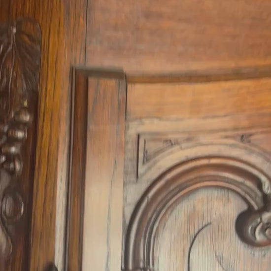 This antique French oak armoire, circa 1900, features elegant Louis XV lines, carved paneled doors, and a graceful serpentine crown. Rich oak grain and floral motifs reflect masterful craftsmanship. A timeless storage piece that brings Old World charm and sophistication to any bedroom, hallway, or curated living space.