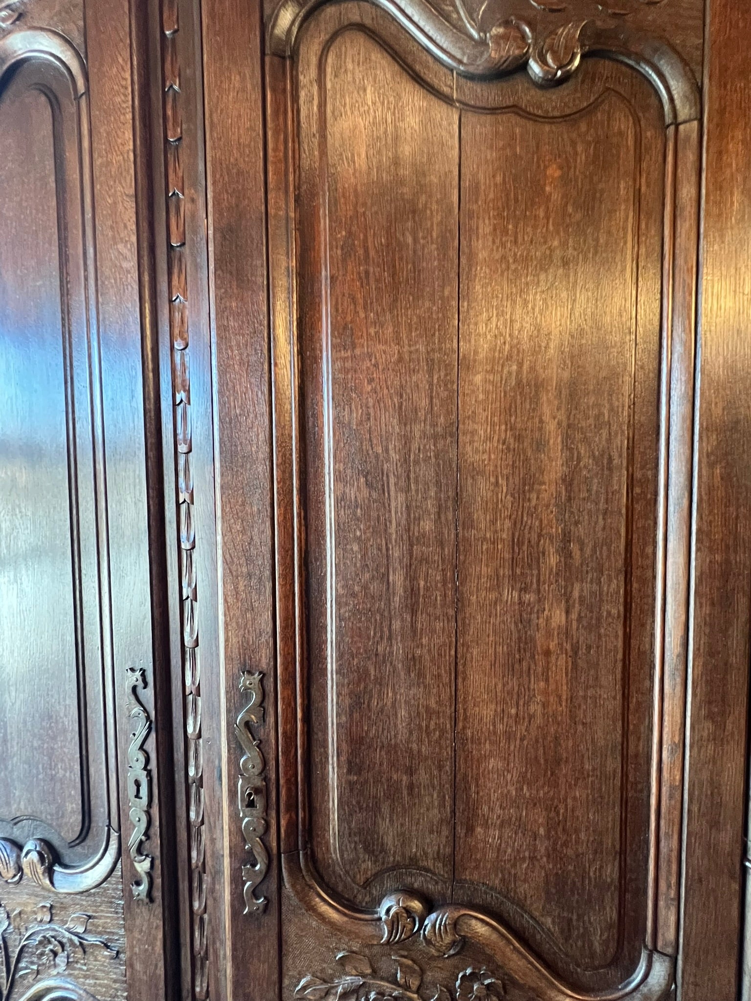 This antique French Normandy armoire made circa 1900, is crafted from solid oak with exquisite hand-carved floral and foliate details. Featuring original brass escutcheons and paneled doors, its tall, narrow form offers timeless elegance and practical storage. A stunning heirloom piece that blends Old World charm with functional beauty—now available in our showroom.