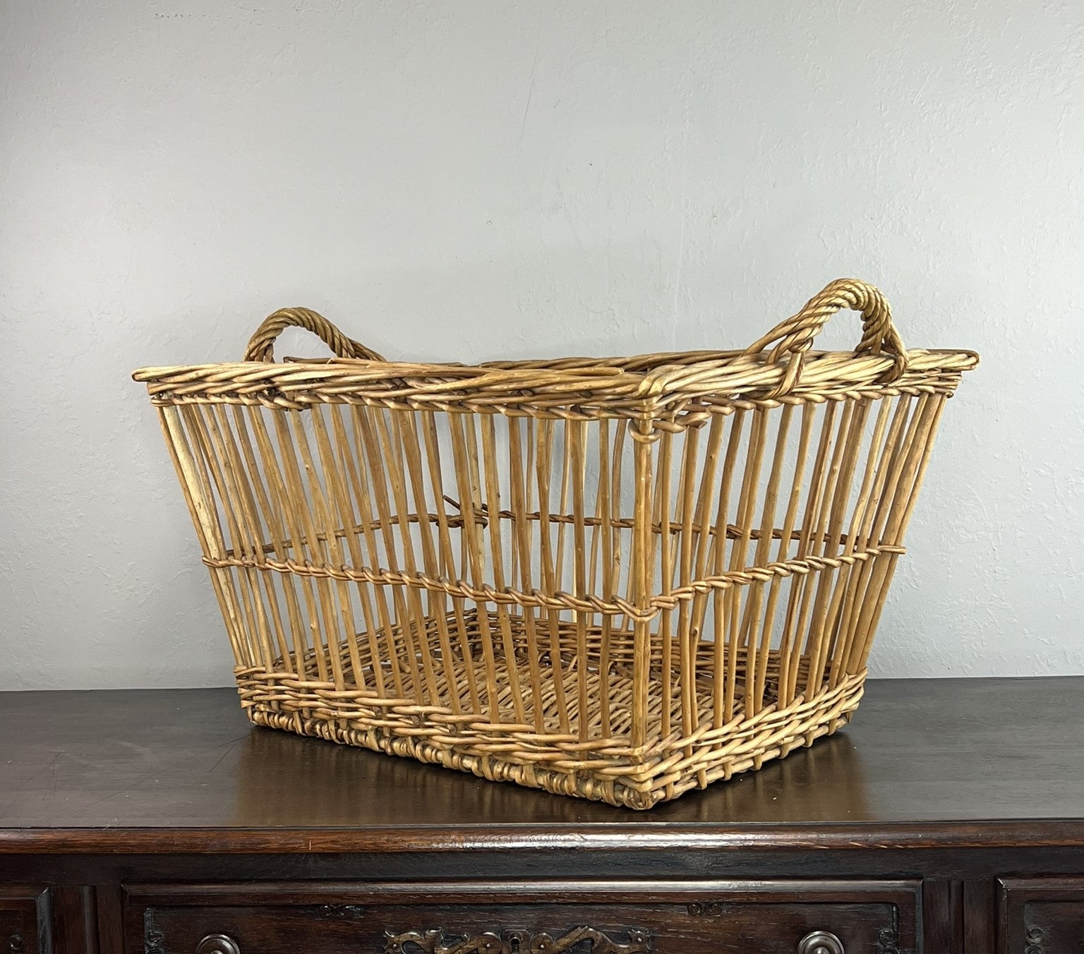 Authentic vintage French wicker laundry basket, beautifully handwoven with twisted handles and open-weave sides for airflow. Lightweight yet sturdy, it’s perfect for farmhouse laundry rooms, blanket storage, or display. A timeless piece of rustic European utility.