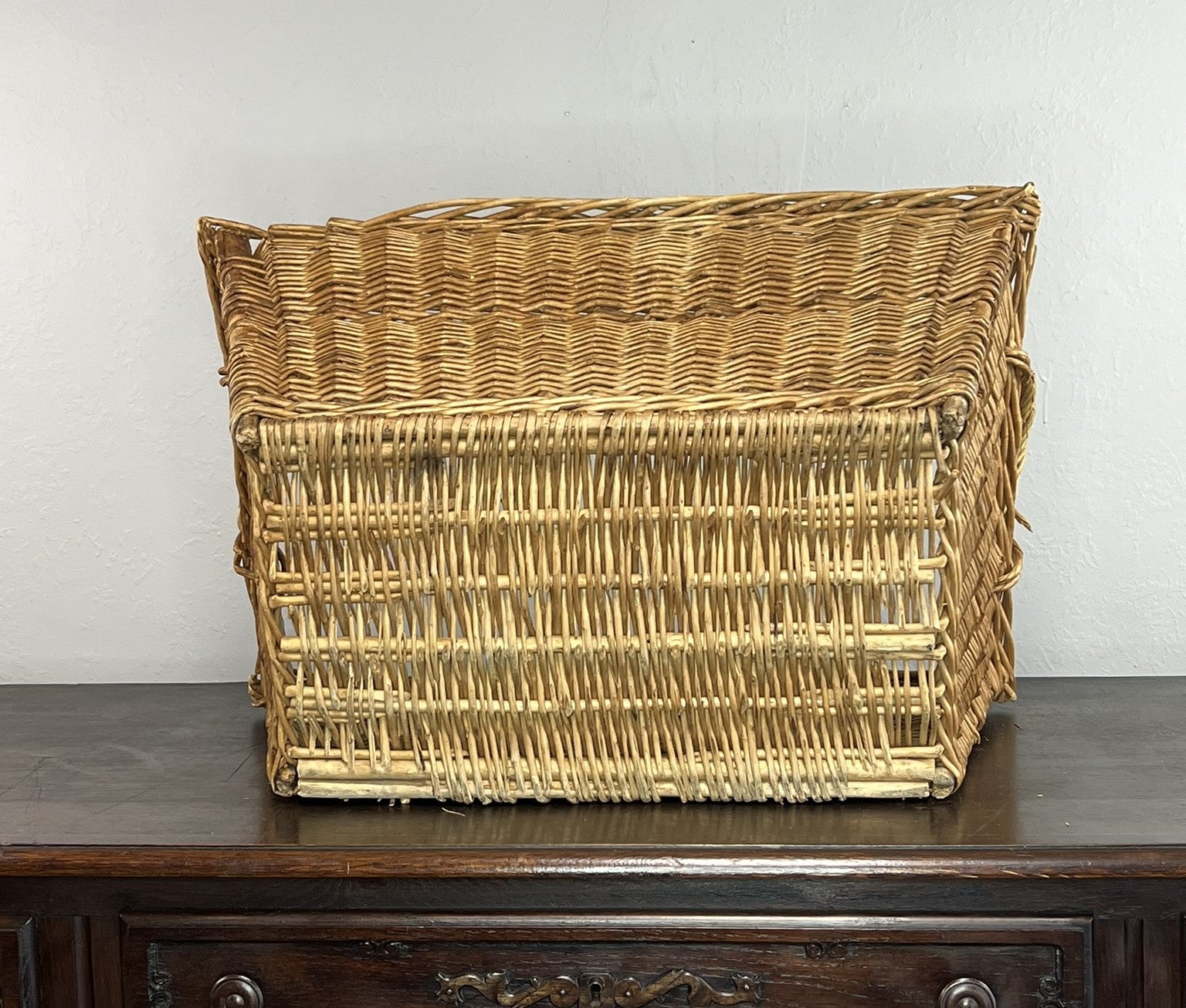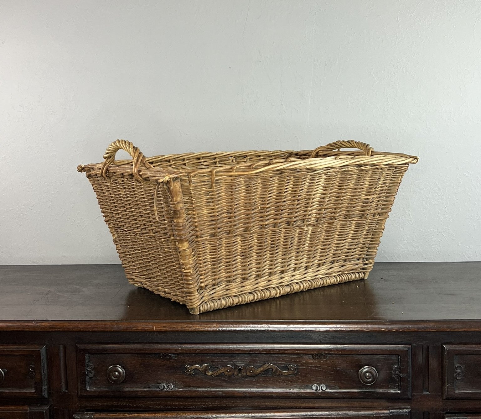 Add rustic charm to your home with this vintage handwoven wicker basket, featuring warm natural tones and sturdy twisted handles. Perfect for farmhouse decor, storage, or autumn displays. A timeless piece with beautiful patina and character—ideal for styling dried florals, firewood, or as a catchall by the door.