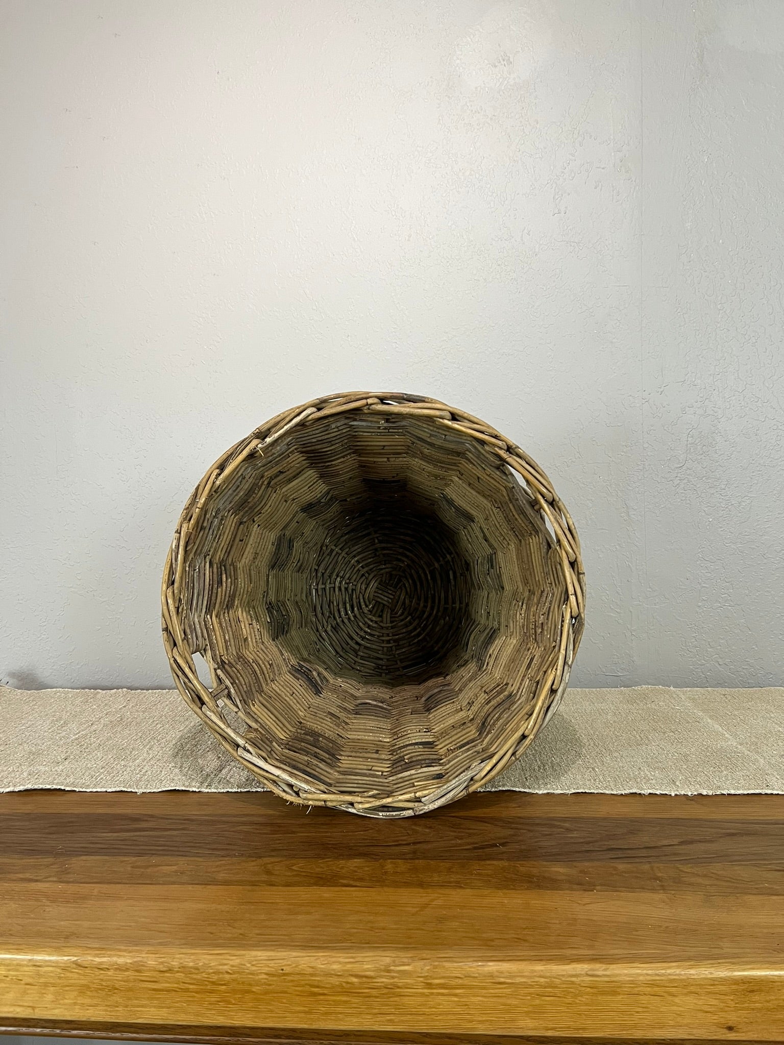 Charming vintage wicker basket with twisted handles, ideal for rustic storage or decor. Handwoven with rich, warm tones and sturdy construction. Measures approx. Style it with firewood, blankets, or florals. A timeless, functional accent with European farmhouse appeal.