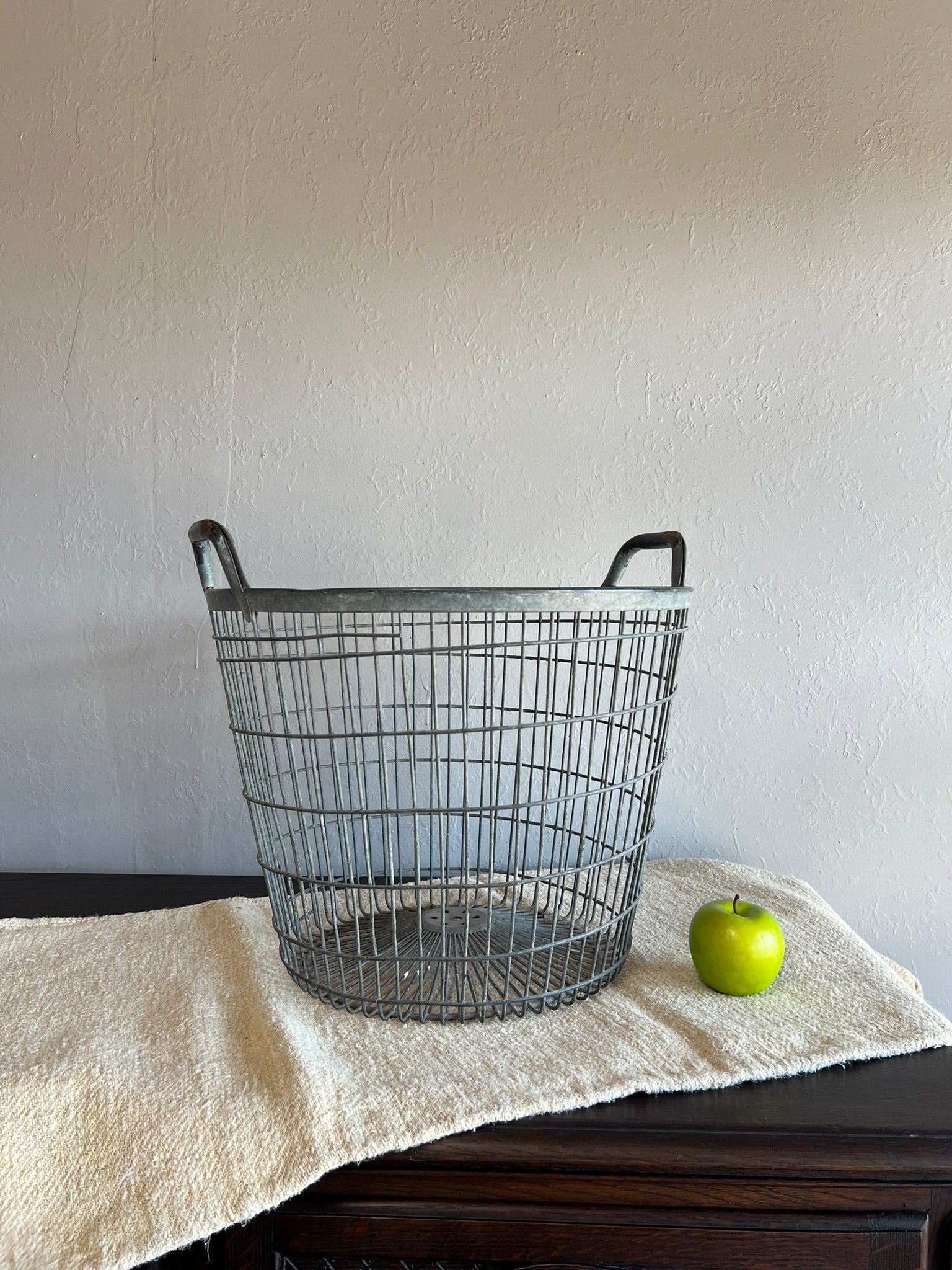Authentic vintage Hungarian metal apple basket, once used in European orchards. Its sturdy wire frame and rustic patina make it perfect for farmhouse storage, holding blankets, firewood, or produce. A versatile decorative accent that brings timeless charm and function to any home.