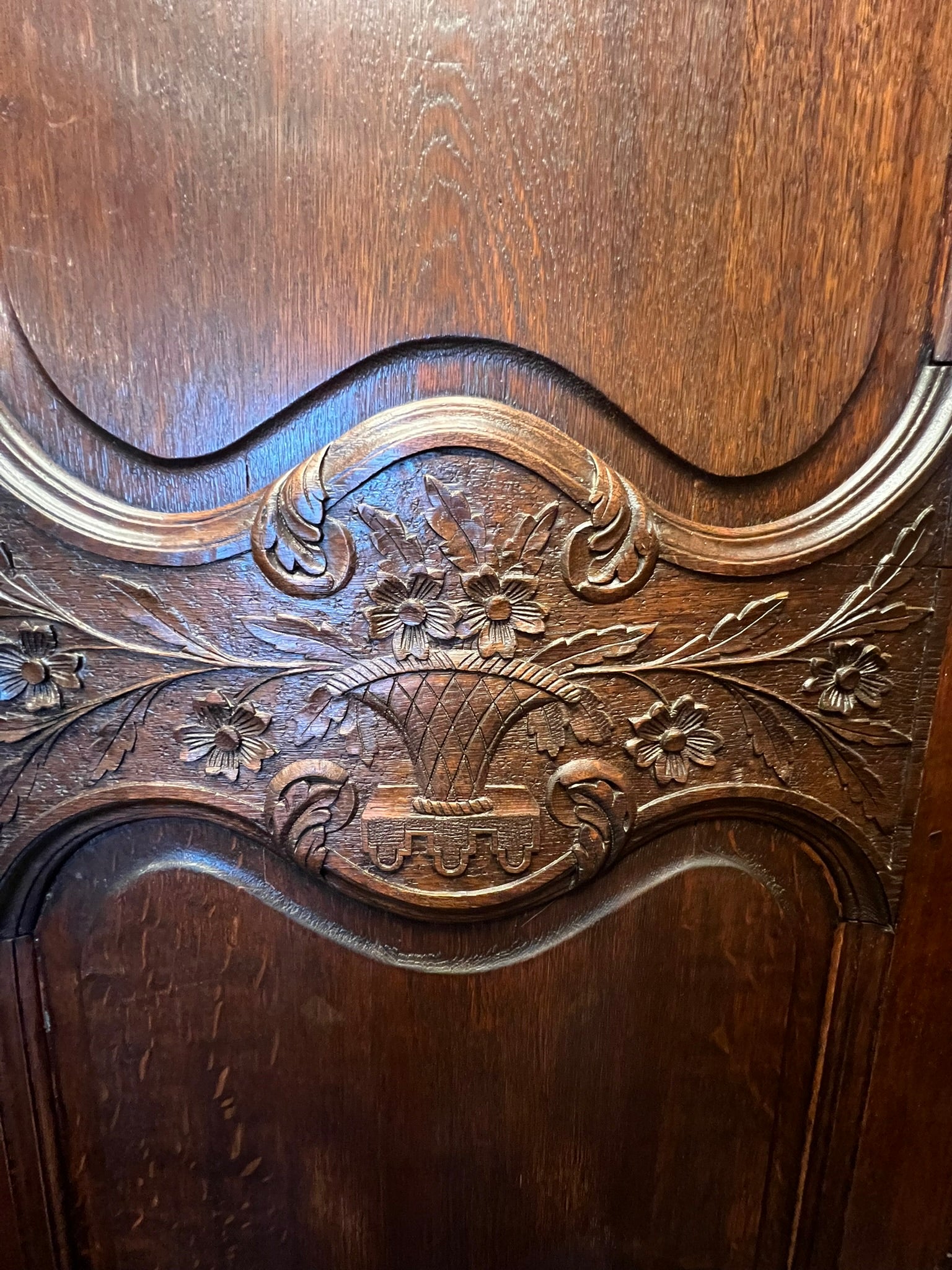 This antique French Normandy bonnetière, circa 1900, is crafted from solid oak with exquisite hand-carved floral and foliate details. Featuring original brass escutcheons and paneled doors, its tall, narrow form offers timeless elegance and practical storage. A stunning heirloom piece that blends Old World charm with functional beauty—now available in our showroom.