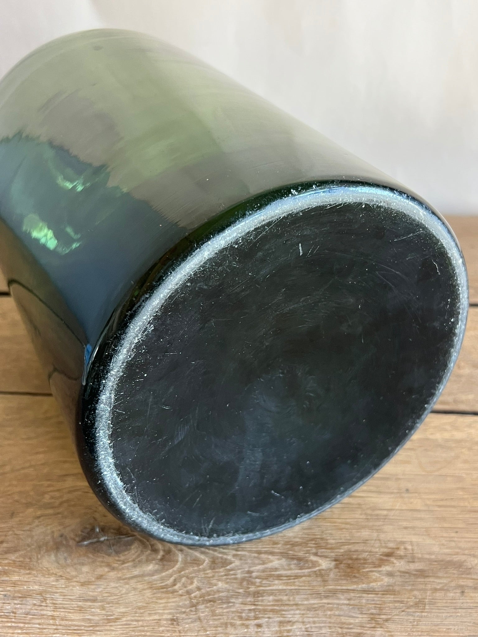 Handblown and beautifully imperfect, this oversized demijohn features gorgeous rippling glass, soft natural patina, and light-reflecting clarity that dances in the sun. Its scale and silhouette make it a statement piece whether styled solo, with dried branches, or grouped in a vignette.