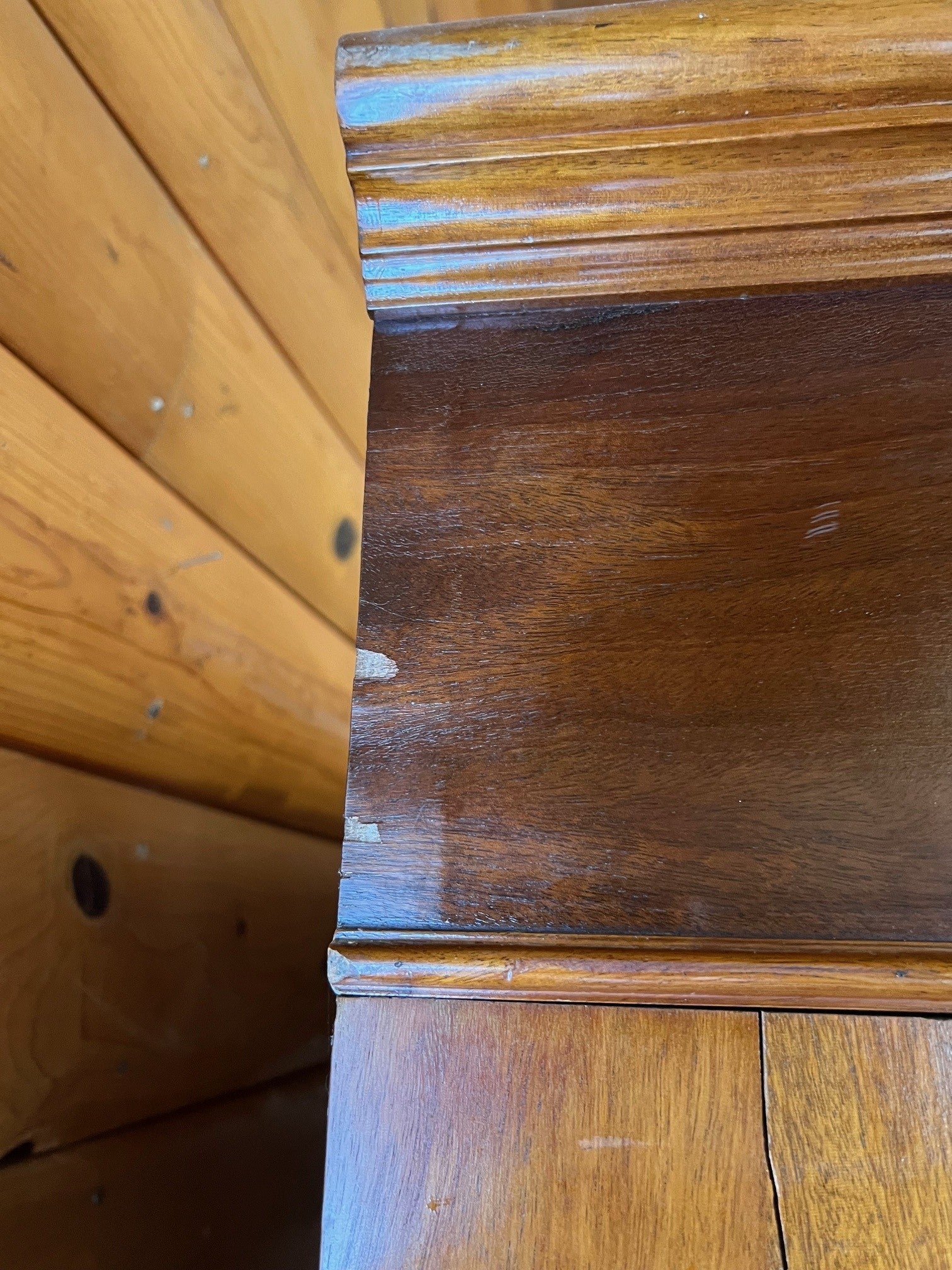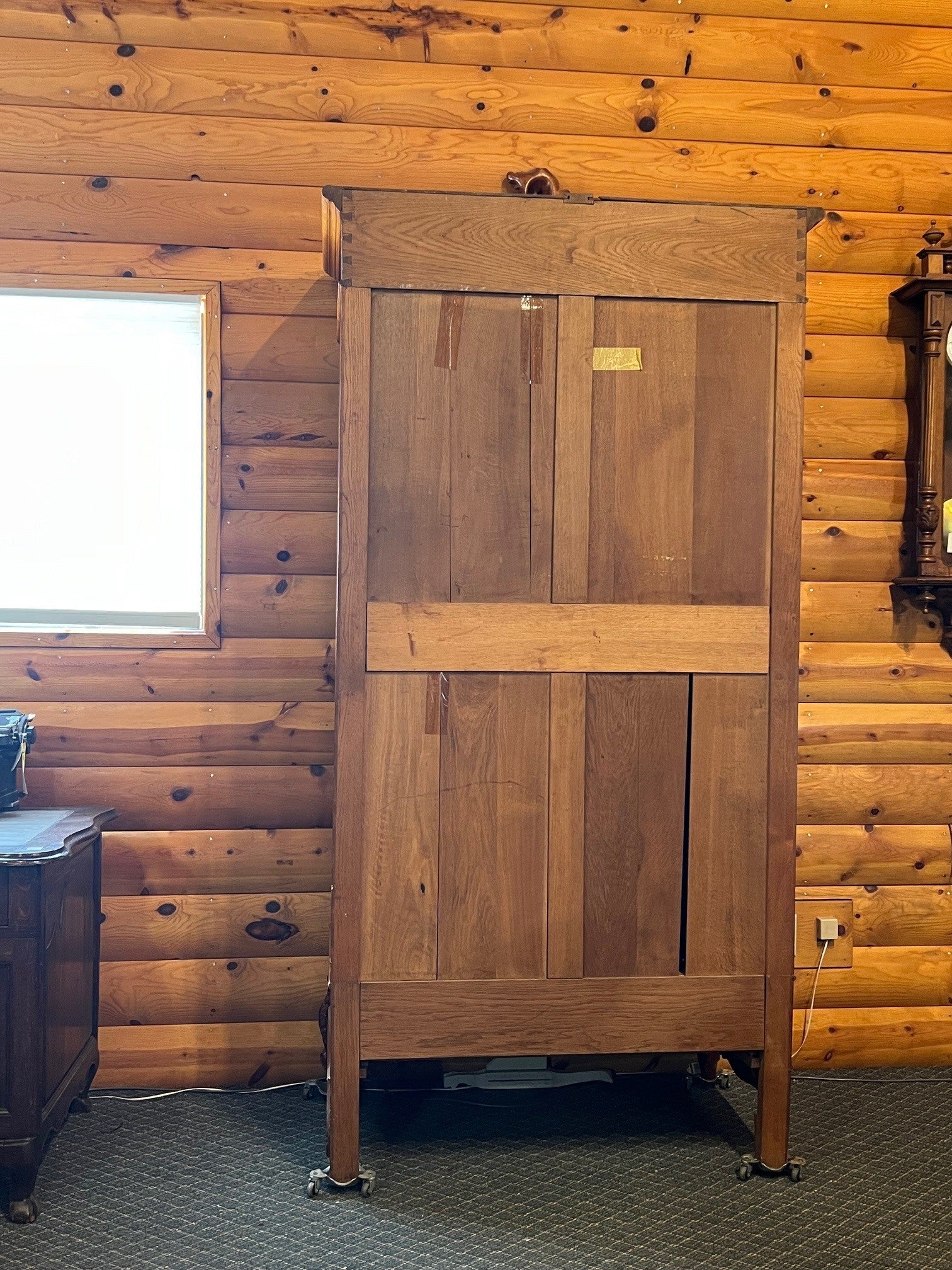 Please note that all vintage and antique pieces have signs of wear and age, including minor scratches, dents, or discolor. This armoire has splitting on each side panel - see photos. This piece disassembles for easier transportation, top, bottom and sides and mirrored door can be dismantled. Shipping quote available upon request.
