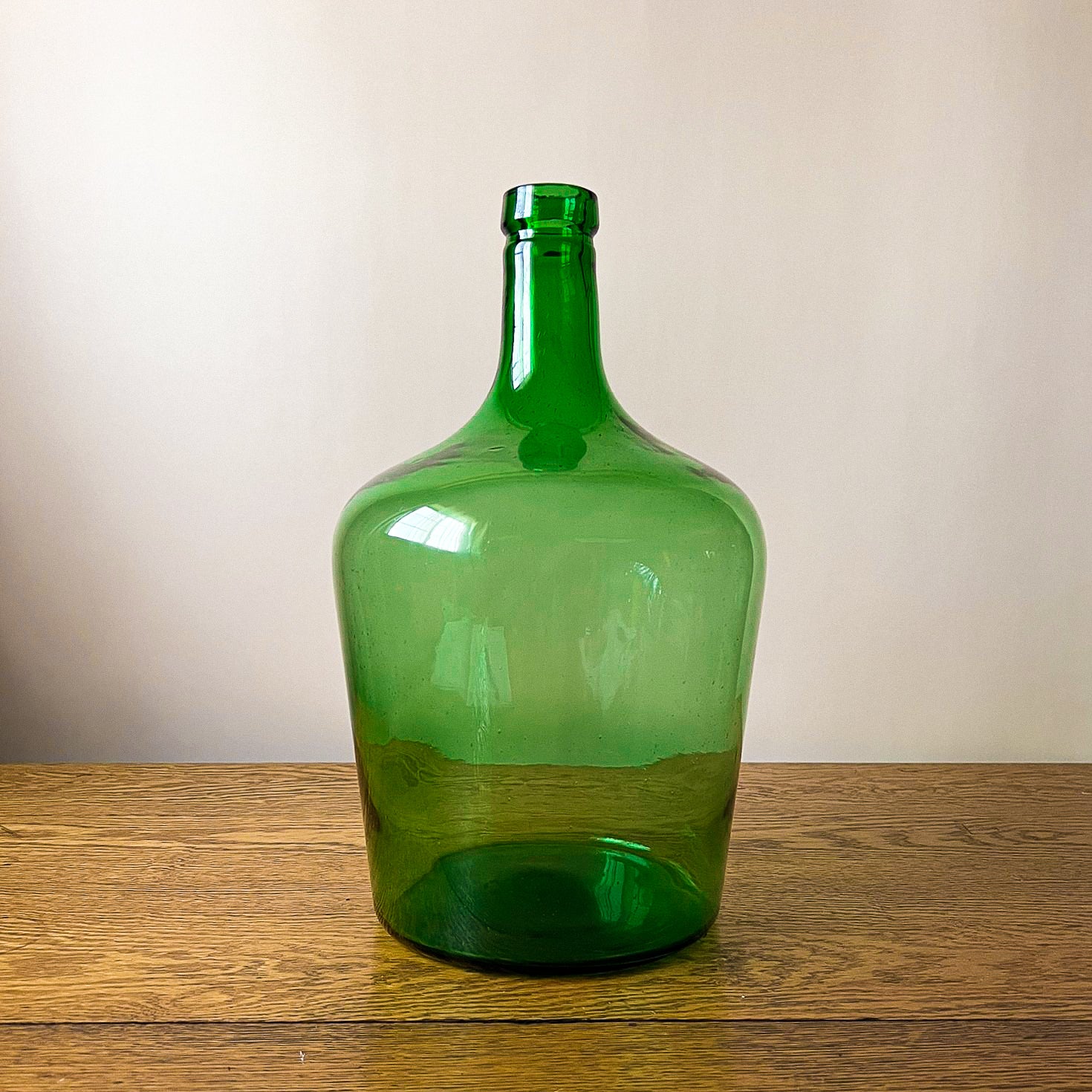Handblown from green glass, its form is beautifully bulbous with a tapered neck, natural bubbles, and the kind of imperfections only time and craftsmanship can create. Whether styled alone on a floor or layered into a collection of vintage glassware, this demijohn brings depth, soul, and organic texture to any space.