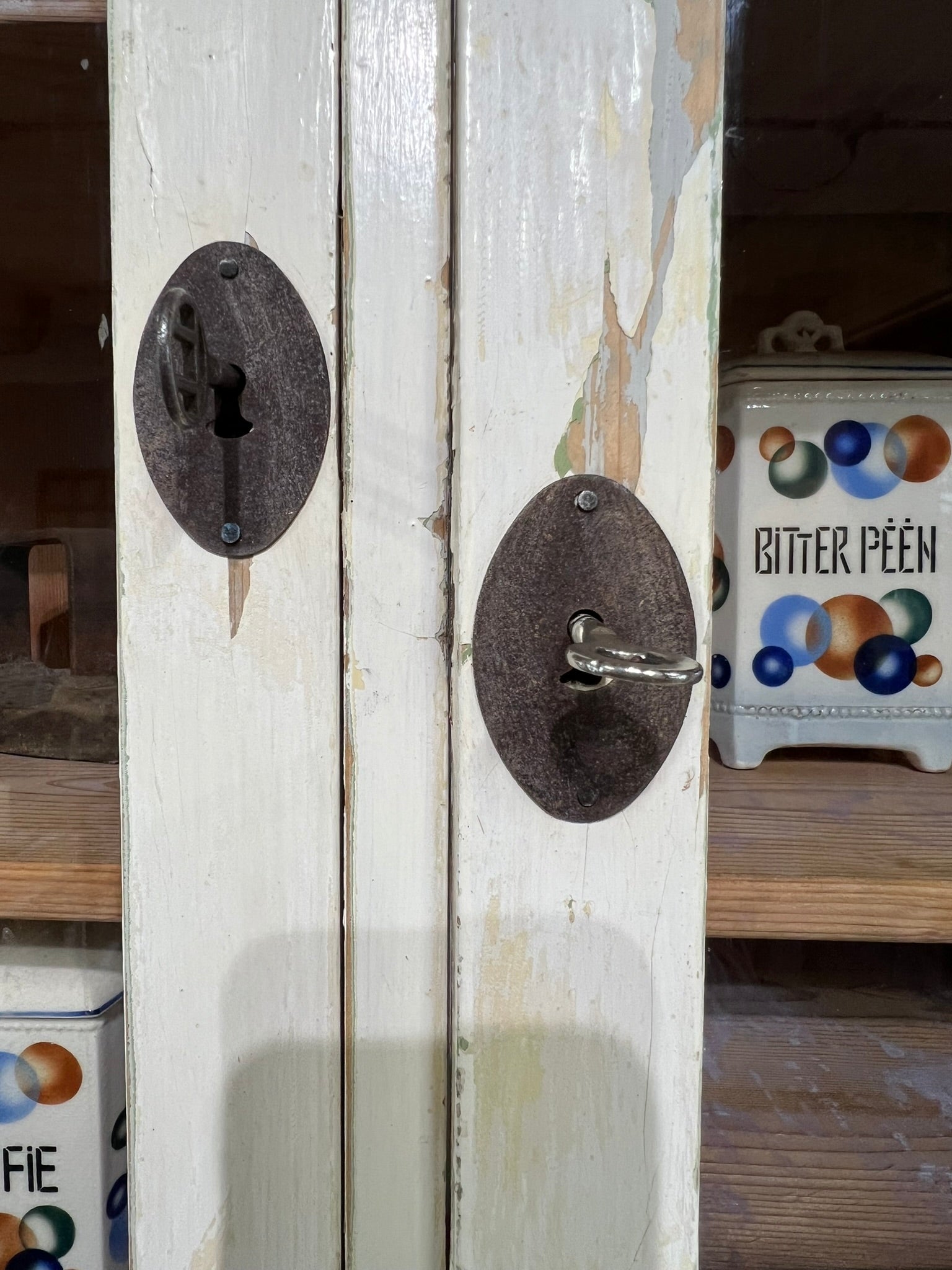 Charming and full of character, this vintage German pine hutch features distressed white paint, original hardware, and generous storage with drawers, cabinets, and glass-front display shelves. A timeless farmhouse addition for your kitchen or dining space, blending rustic utility with antique European soul.