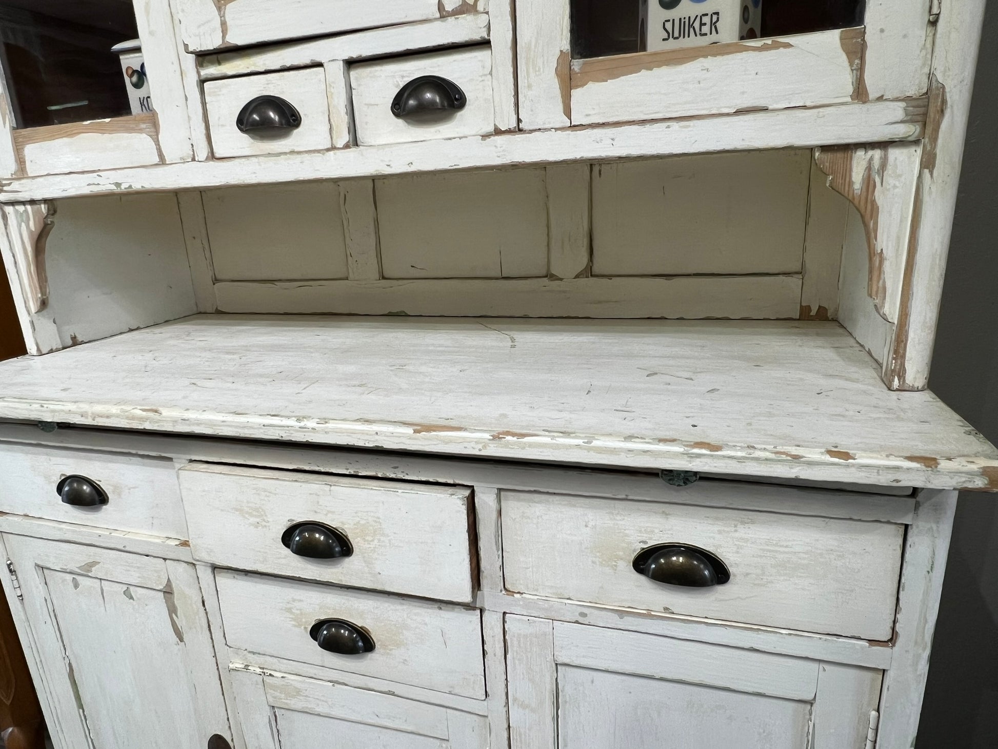 Vintage German Pine Hutch in Distressed White Paint, Glass Doors & Ample Storage #108