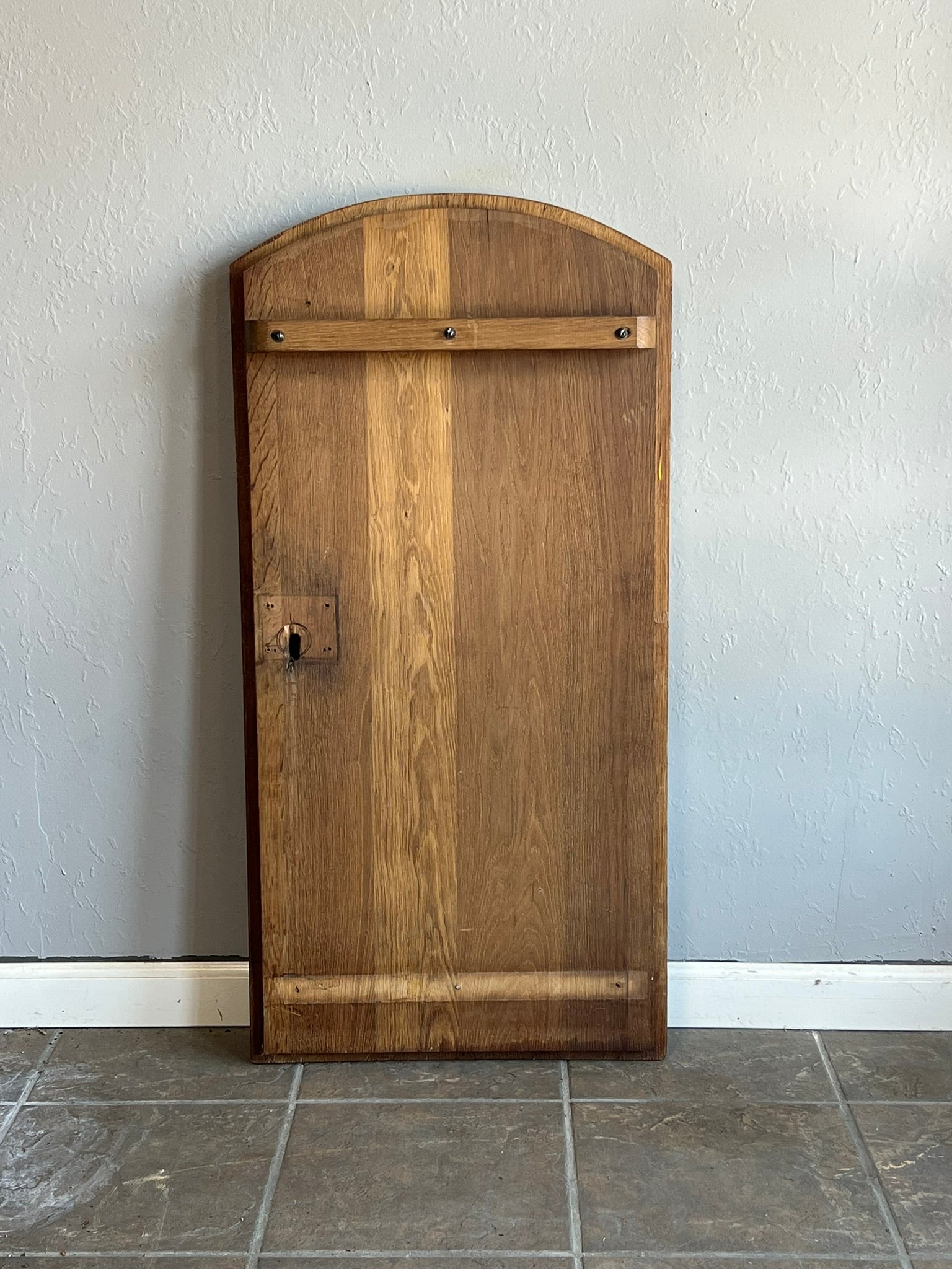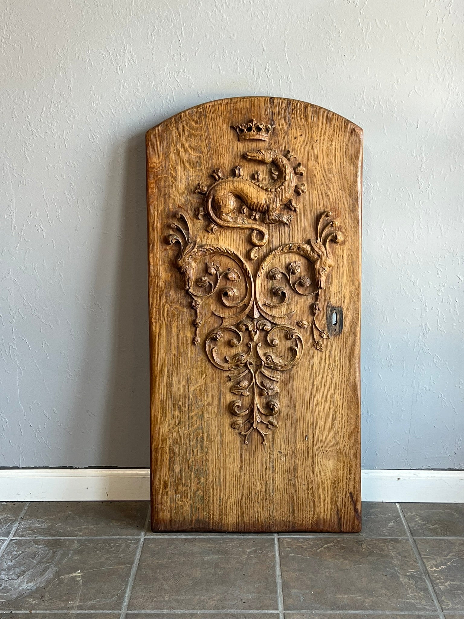This antique French window shutter, hand-carved from solid oak, features a crowned dragon crest and ornate scrollwork. Dating to the 19th century, it brings a regal, Old World charm to any space. Use as wall art, a headboard accent, or a unique architectural element.