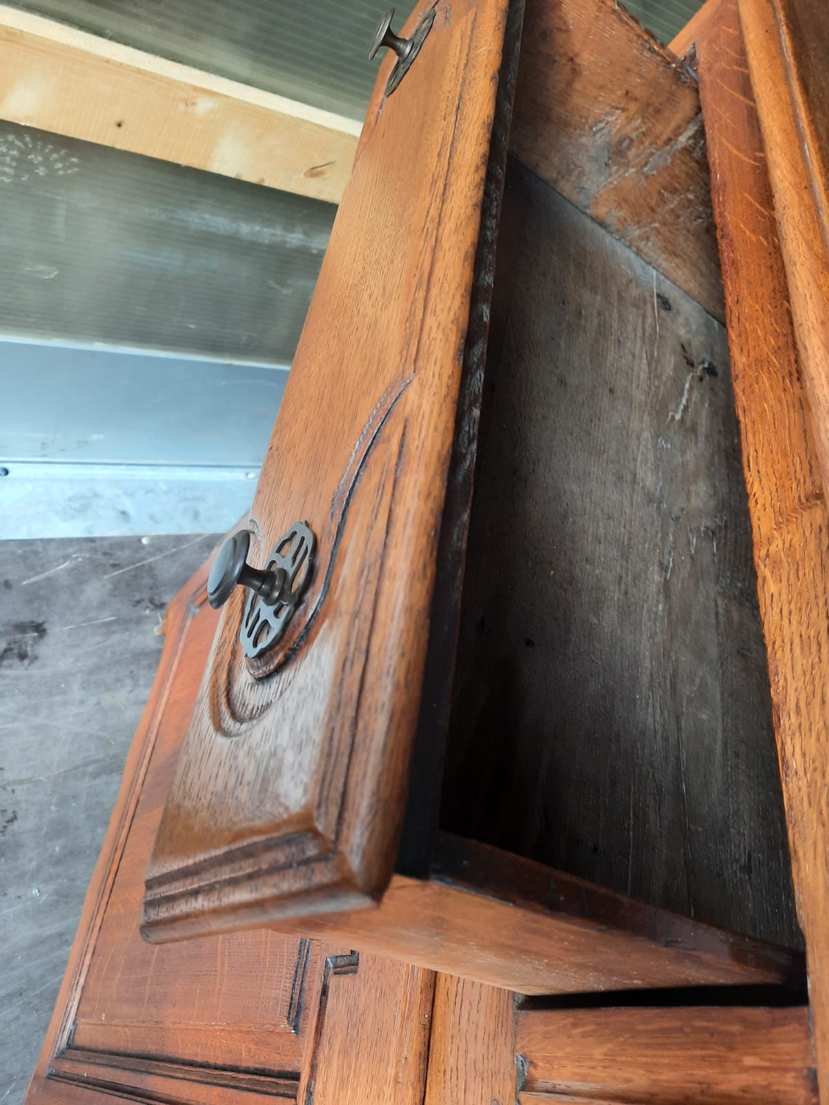 This elegant French oak sideboard, crafted circa 1900, features beautifully carved paneled doors, original brass hardware, and classic cabriole legs. Its rich patina and timeless craftsmanship make it a stunning statement for any dining or living space. A versatile heirloom piece ready to elevate your interior.