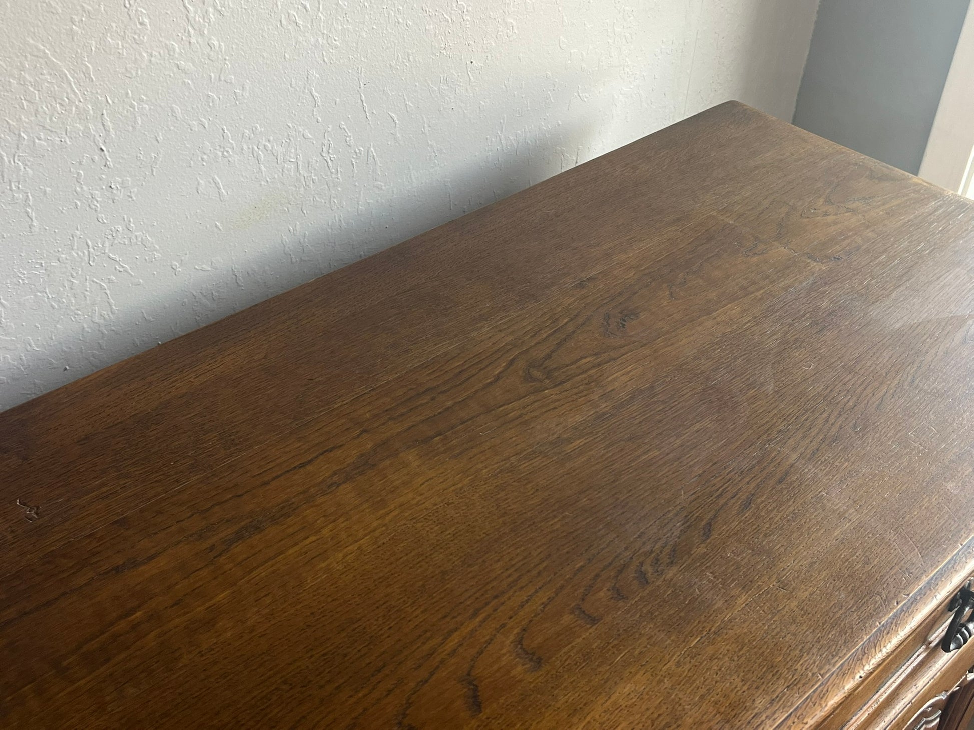 This vintage French oak buffet features two paneled doors, dovetailed drawers, and elegant provincial carvings. Built with timeless craftsmanship, it offers both storage and style, perfect as a sideboard, entry cabinet, or accent piece. Rich oak grain and original hardware make it a versatile addition to traditional, rustic, or French country interiors.