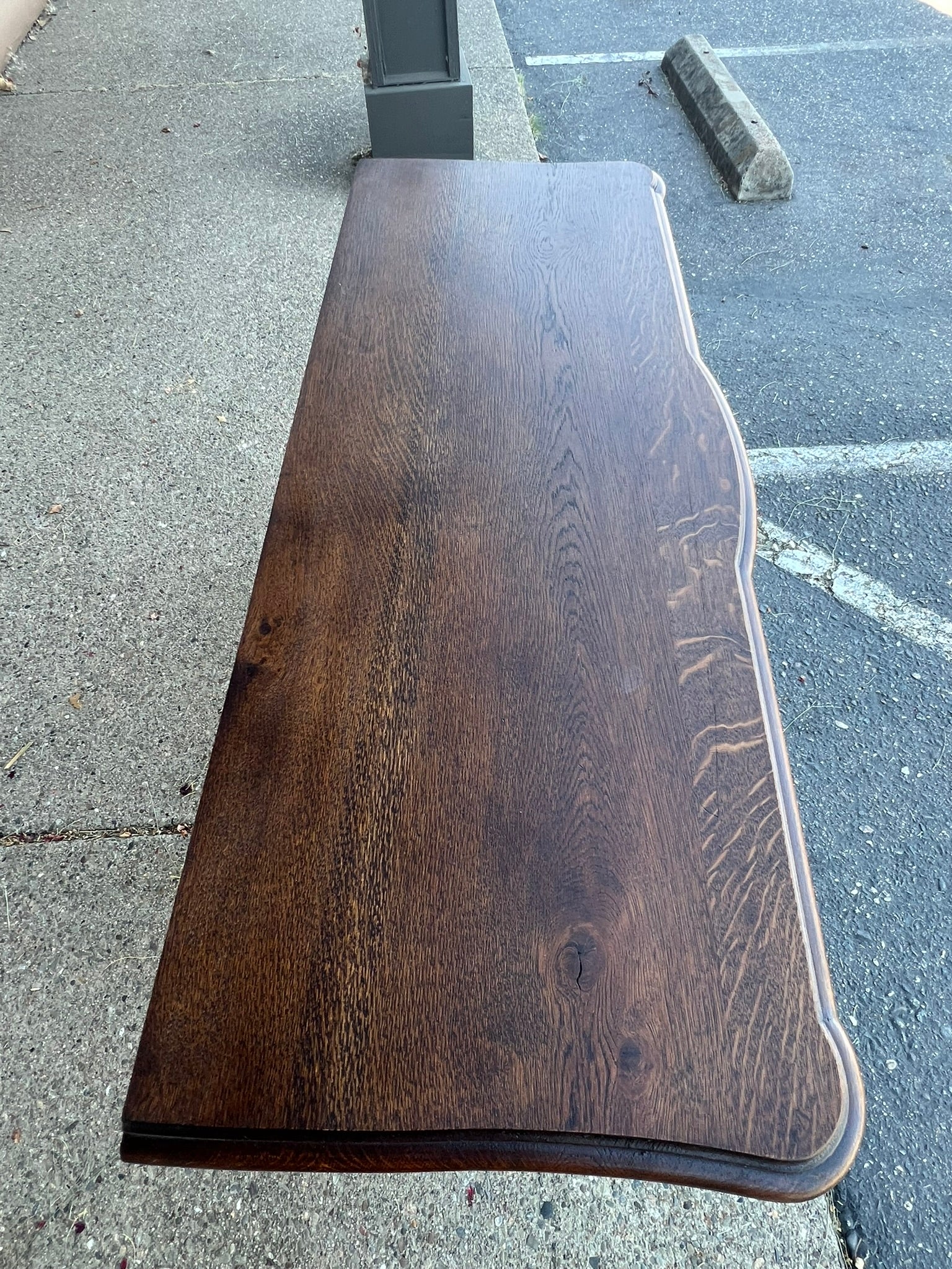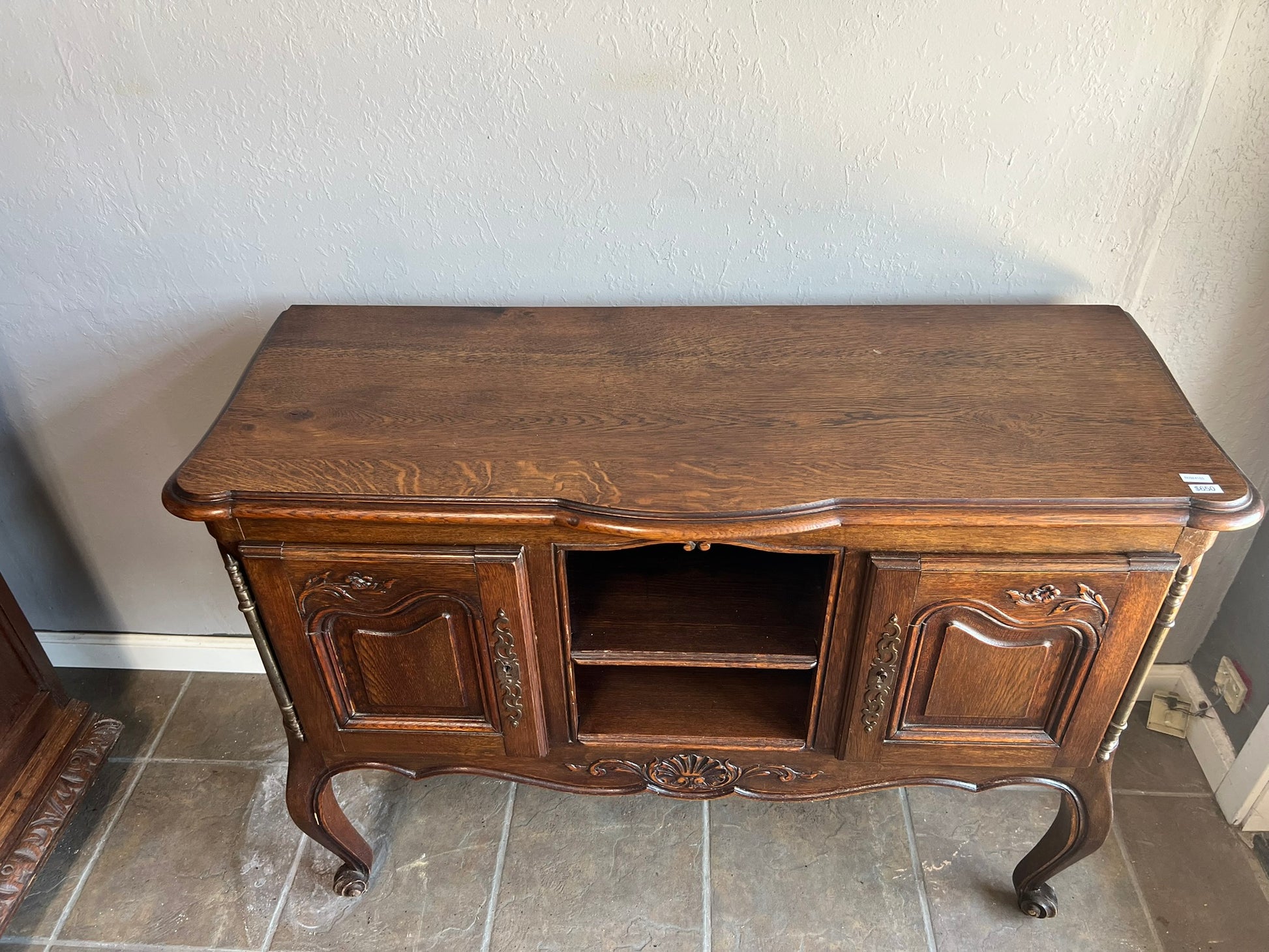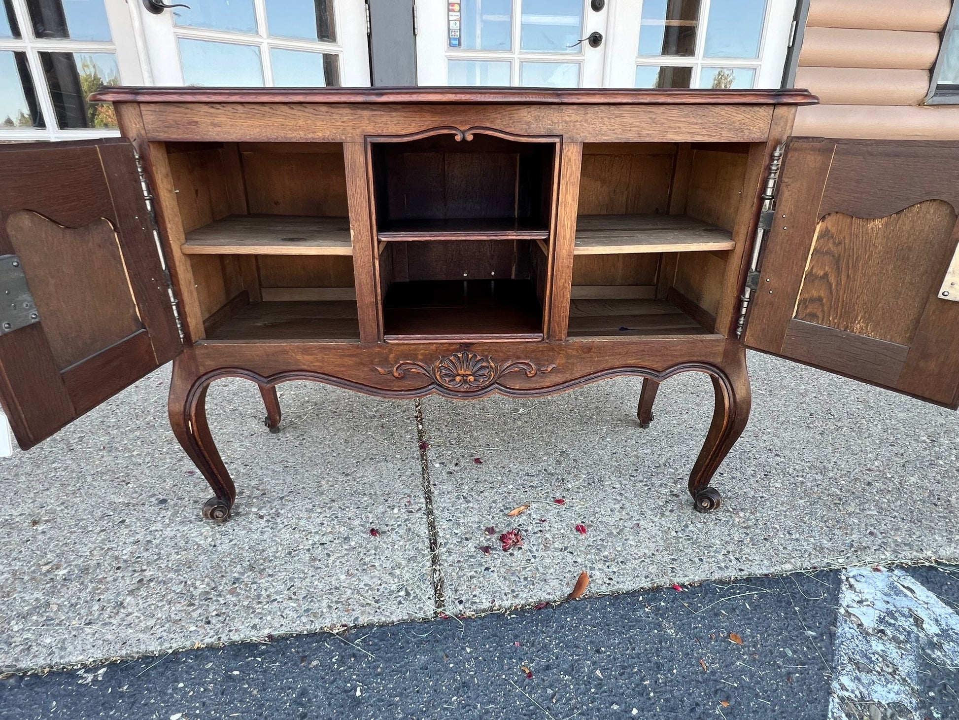 This vintage Belgian oak sideboard features exquisite floral carvings, brass barrel hinges, and classic cabriole legs. Crafted circa 1900, its warm patina and elegant curves add charm and utility. With shelved storage and a center display niche, it’s perfect for your dining room, hallway, or curated antique collection.