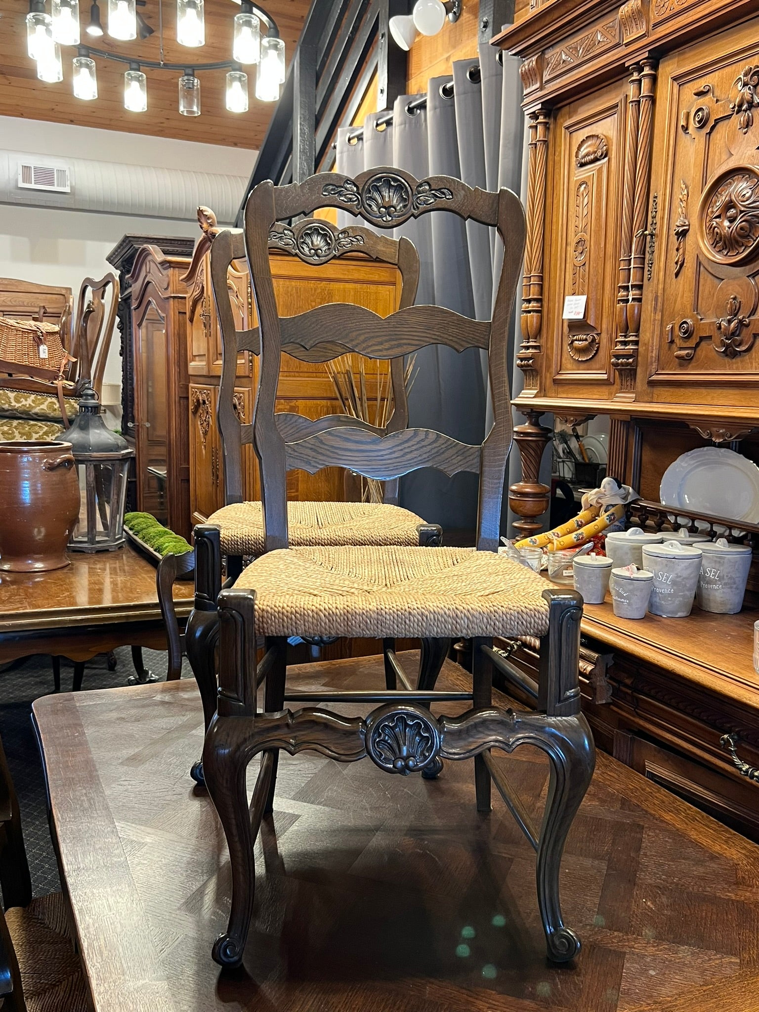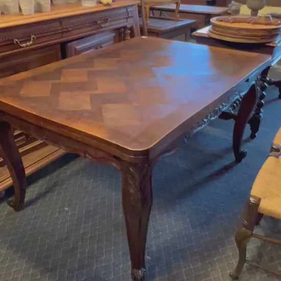 This rare French oak dining table features exquisite parquetry with matching pull-out leaves and six hand-carved chairs. The graceful cabriole legs, scalloped aprons, and rich patina evoke timeless French countryside charm. Each rush seat chair is adorned with a shell-carved crest and stretcher detail. A stunning heirloom-quality set perfect for elegant dining and everyday gatherings. Circa early 1900s, solid and beautifully preserved.
