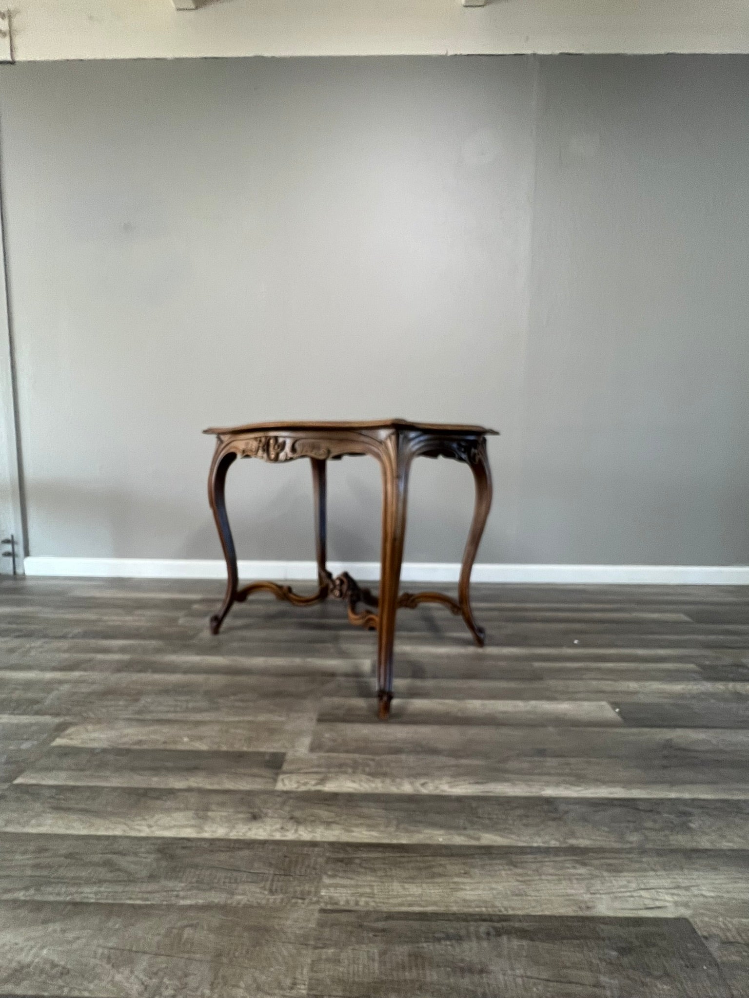 This antique French walnut Louis XV occasional table features elegant cabriole legs, hand-carved floral motifs, and a gracefully shaped top. A timeless piece from the 19th century, it brings refined European charm and versatile function to any space, perfect as a side, console, or entryway table.