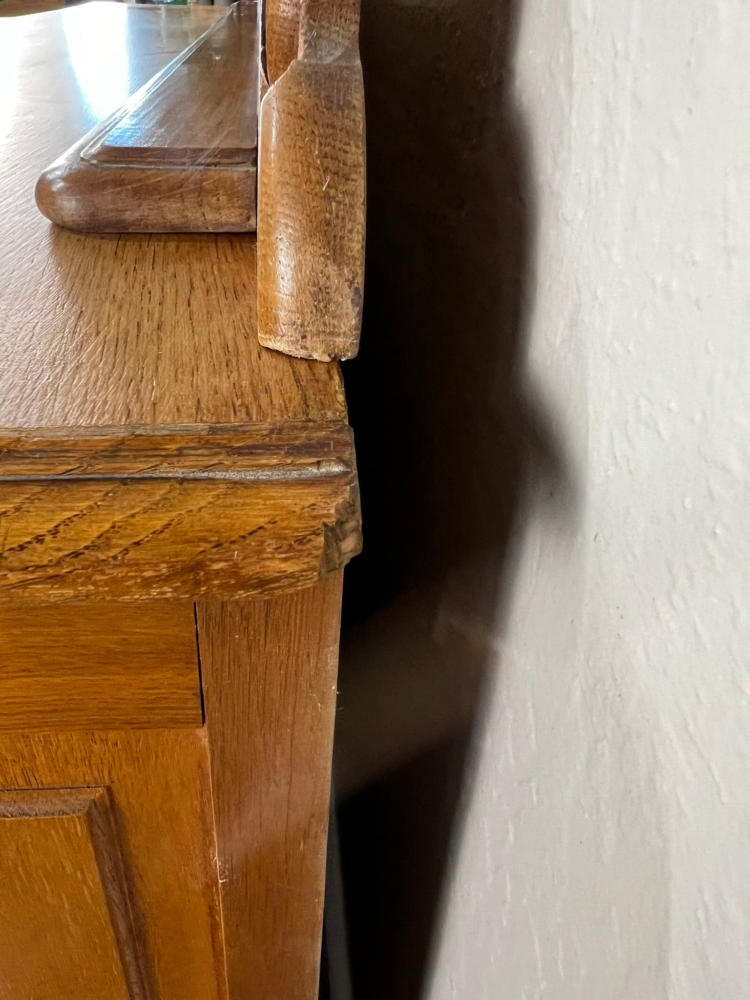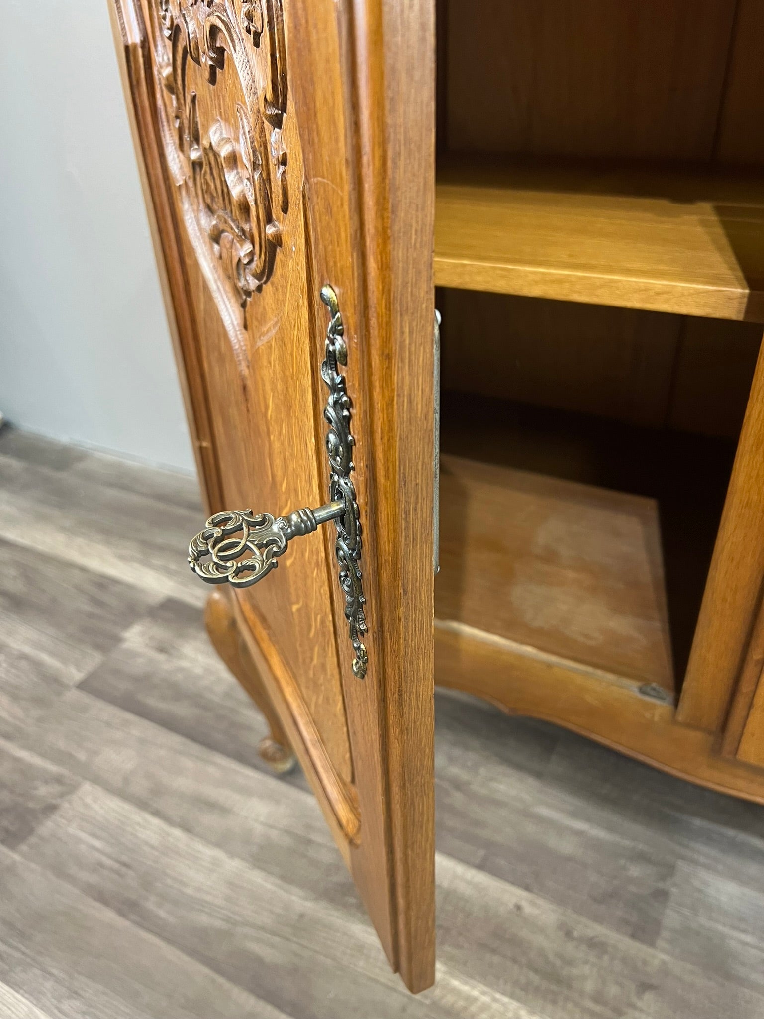 Elevate the sophistication of your dining room or living space with our exquisite Vintage Belgian Dark Oak Buffet, a timeless masterpiece that seamlessly blends Old World charm with modern functionality. Crafted from rich, warm oak and adorned with intricate carving details, this buffet exudes a sense of rustic elegance that adds warmth and character to any interior. Featuring four raised panel doors and four drawers with delicate carving accents, our Belgian buffet captures the essence of traditional craftsmanship. Each detail tells a story of artistry and heritage, evoking a sense of nostalgia and timeless beauty that transcends trends and fads. Made ca. mid twentieth century.