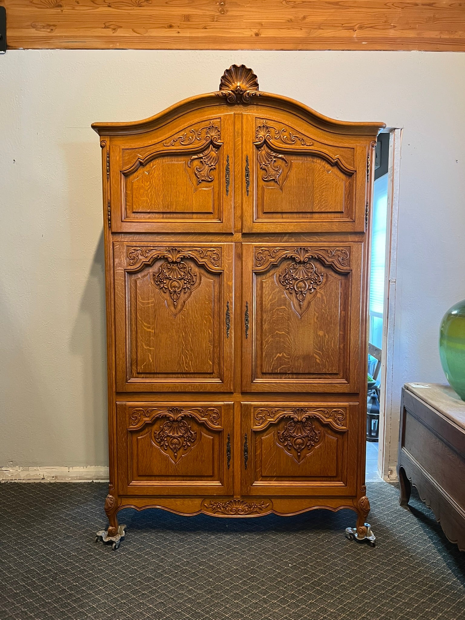 This vintage Belgian oak armoire features elegant slide-in doors, intricate carved panels, and a graceful, scalloped crown. Spacious interior shelving offers versatile storage, while its timeless craftsmanship makes it both functional and decorative. A striking European statement piece, perfect for bedrooms, dining rooms, or entryways.
