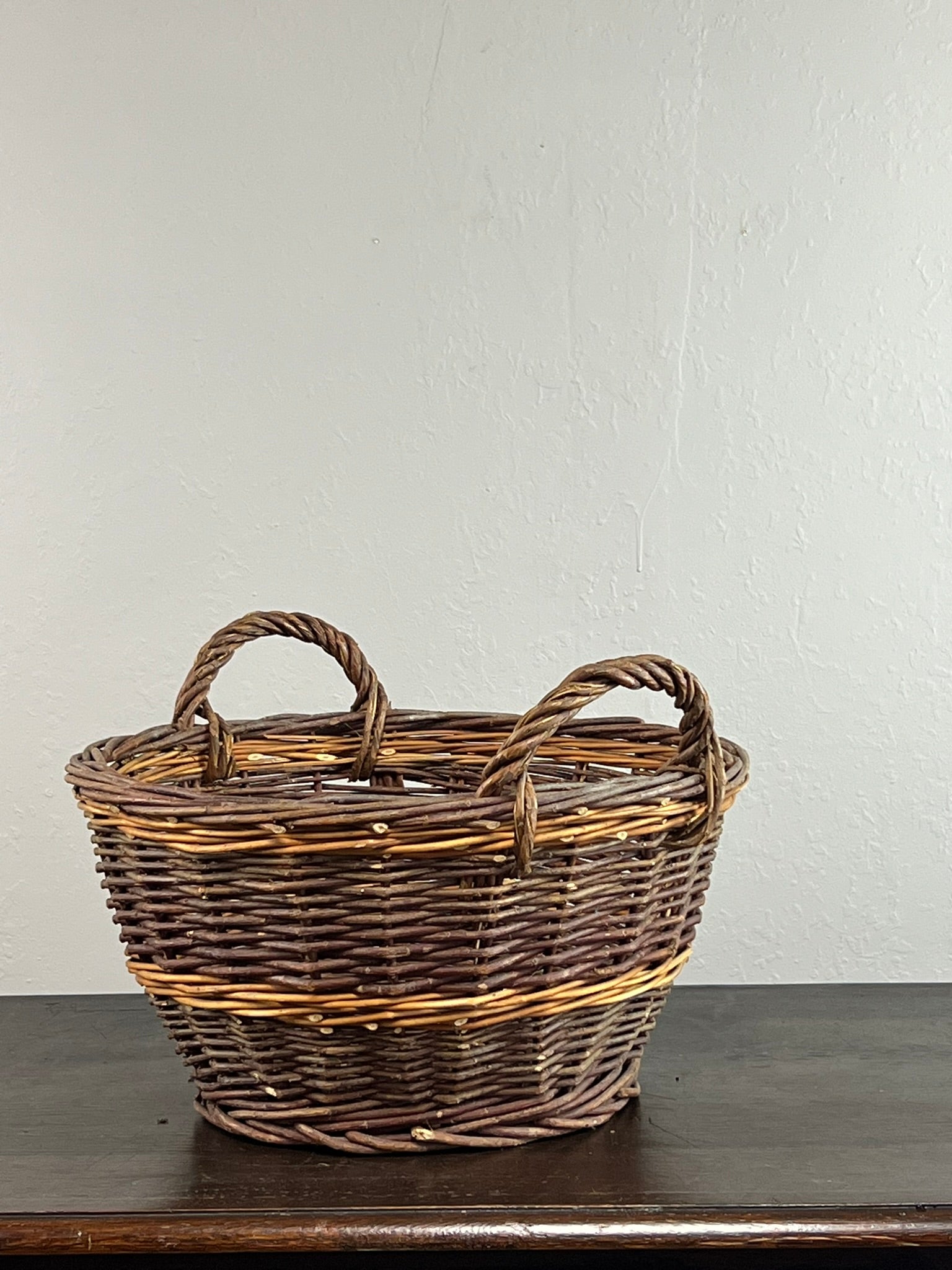 Add rustic charm to your home with this vintage handwoven wicker basket, featuring warm natural tones and sturdy twisted handles. Perfect for farmhouse decor, storage, or autumn displays. A timeless piece with beautiful patina and character—ideal for styling dried florals, firewood, or as a catchall by the door.